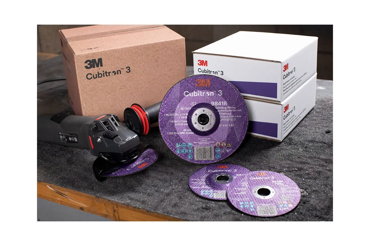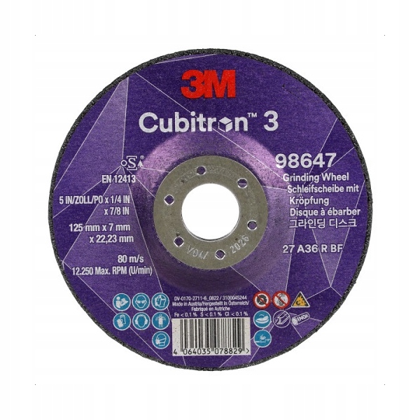Зачистной круг 3M Cubitron™ 3, Т27, 125х7,0х22,23 мм, A36+, армированный, разработан для удаления тяжелых сварных швов и других тяжелых операций шлифования практически всех материалов, а также специально разработан для использования на нержавеющей стали, мягкой стали и аэрокосмических сплавах. Имеет утопленный центр, который позволяет шлифовать под любым углом, и подходит для использования практически со всеми материалами.
