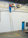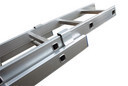 Конструкция данной приставной лестницы — стабильные направляющие профили, которые охватывают боковины. Имеется защелкивающийся автоматически стопорный рычаг, который предназначен для безопасной транспортировки изделия.
