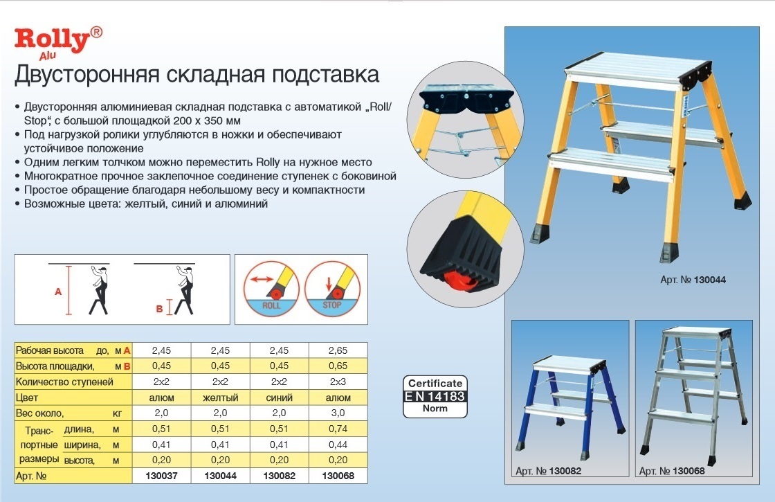 Двусторонняя универсальная подставка Krause MONTO ROLLY 130068 — прочная, стойкая стремянка для внутренних бытовых работ. Легко перемещается, благодаря системе Roll/Stop. Рабочая высота подставки - 2,65 м. Простая в использовании и малогабаритная, с защитой от случайного складывания и крепким алюминиевым корпусом.