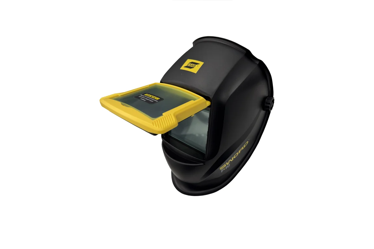 Сварочная маска (щиток защитный лицевой) ESAB SWORD F-10, артикул 0700102060, с постоянной степенью затемнения, является средством индивидуальной защиты и предназначена для защиты лица от брызг расплавленного металла и горячих частиц неионизирующих излучений, механических воздействий. Корпус из легкого полипропилена обеспечивает полную защиту лица, что позволяет использовать маску для сварки в любых пространственных положениях. Оголовье регулируется в трёх положениях. Маска поставляется в комплекте со светофильтром размером 90x110 мм со степенью затемнения DIN 10. Светофильтры ESAB, применяемые в масках Sword F-10, изготовлены из минерального стекла, устойчивы к тепловому воздействию, защищают от ультрафиолетового и инфракрасного излучения. Откидной блок светофильтра позволяет быстро перейти к зачистным работам без необходимости снимать маску.
